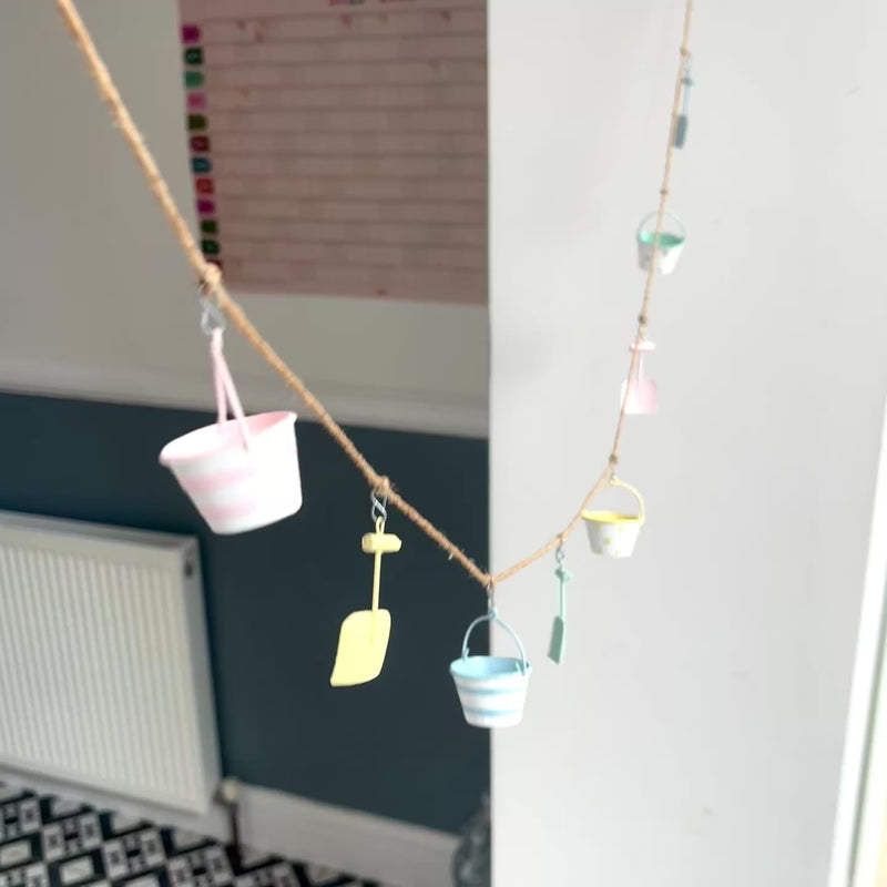 Brighten up any room with this delightful Pastel Bucket and Spade Garland. Featuring charming metal buckets and spades in soft seaside colours, it adds a playful, beachy vibe perfect for a kids’ space. Lightweight and easy to hang, this garland brings a cute, coastal touch that sparks imagination and joy.